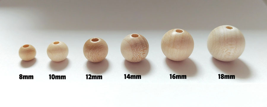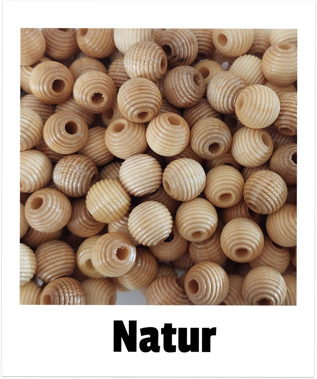 Hier erhalten Sie ca. 30 Holzperlen mit Querrillung aus Ahorn mit einem Durchmesser von 10 mm und einem Fadenloch von ca. 3 mm.